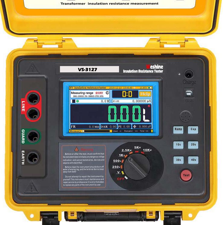 Weshine® VS-3127 est alimenté par batterieIndice de polarisation du transformateuravec affichage d'arc numérique et analogique, conçu pour les tests de résistance d'isolement haute tension dans la maintenance et l'entretien des câbles, des machines d'installation tournante, des transformateurs, des appareillages de commutation et des applications industrielles.